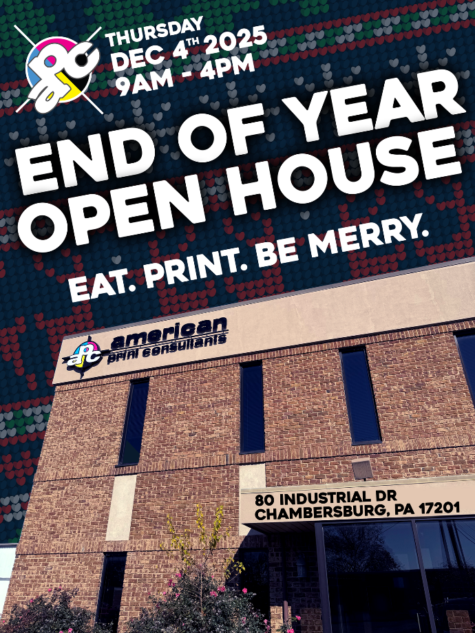 December 4th, we are hosting an Open House from 9:00 AM-4:00 PM as a THANK YOU for your support and connection with APC. Please come visit us at 80 Industrial Dr in Chambersburg, Pennsylvania. Have something to eat, check out some equipment and talk print with APC’s team!