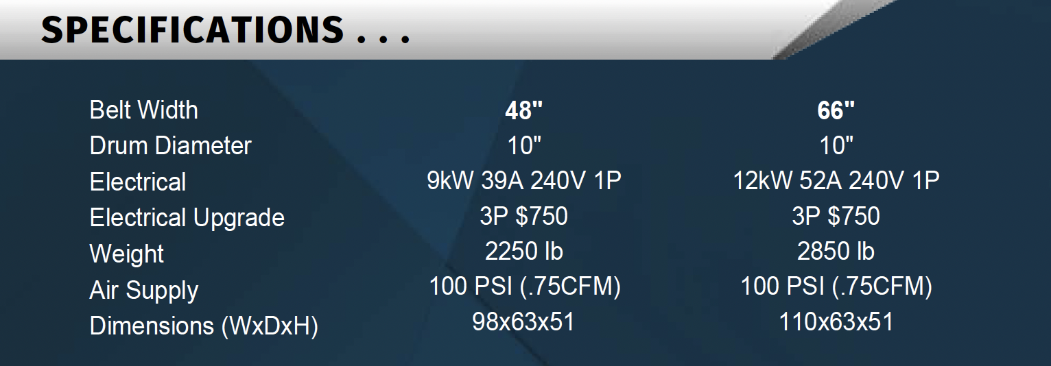 - 48" & 66" belt widths that allow for heat transfer on an array of fabric substrates.