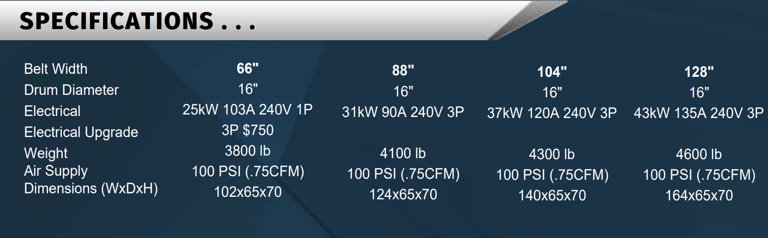 - 66”, 88”, 104″, and 128″ belt widths allow for printing on full-width fabrics