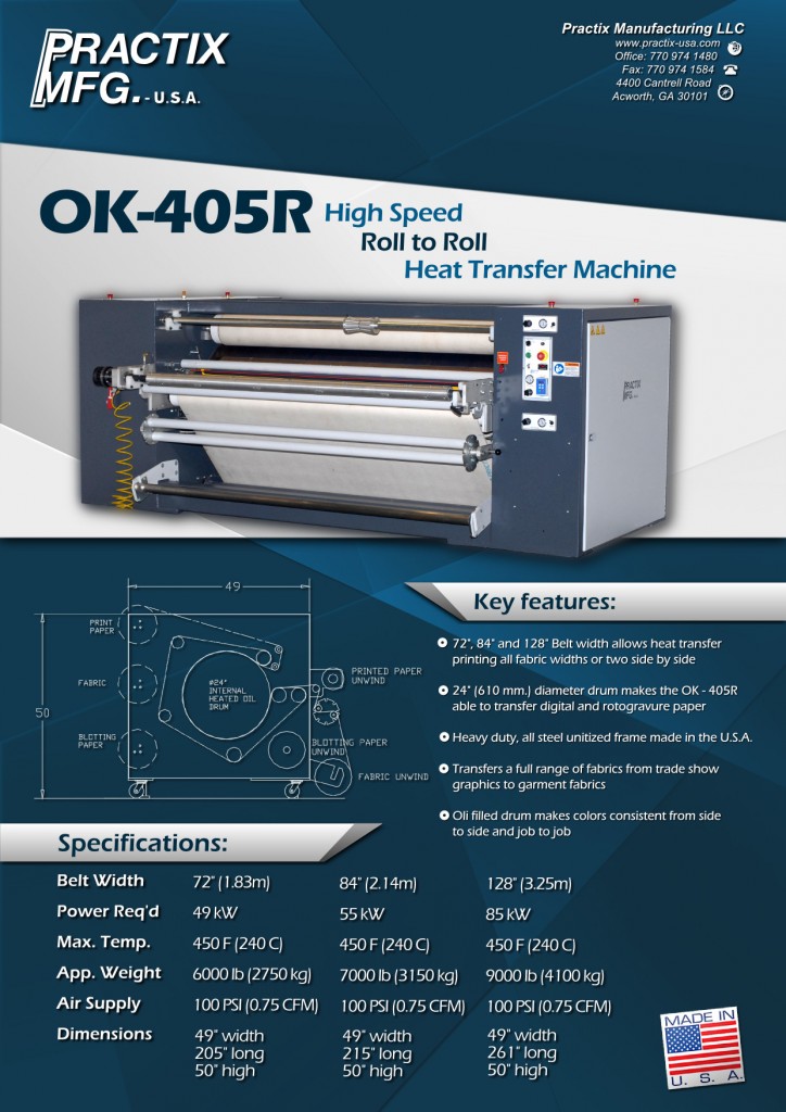 The NEW advanced sublimation machine, the OK-405R, was designed to accommodate the need for faster transfer speeds by our innovative engineers. The workable widths are from 24″ to 200″. The OK-405R was designed with a pivot system for automatic belt tracking, which ensures no lateral movement and “ghosting” on any of your fabric. The OK-405R encompasses even heat to ensure color intensity across even wide fabrics utilizing an advanced technology, well engineered oil filled, steel encased heating drum. This machine enables owners of machines that are struggling to keep up with the increasing speed of newly available industrial printers for the market. Our machine is able to print 10ft/min!