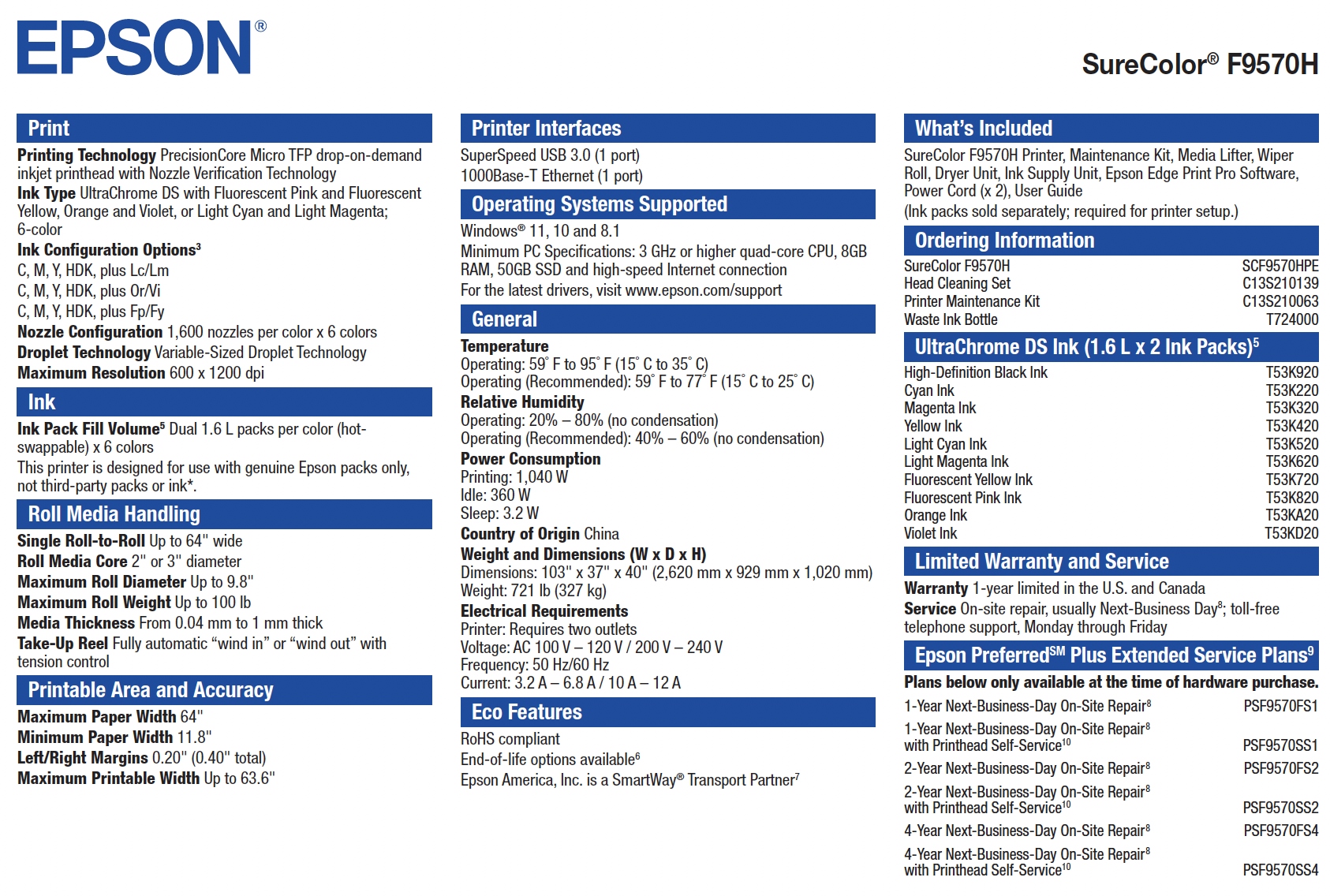 Supercharge your business’s productivity with the high-performance SureColor® F9570H. From the #1 dye-sublimation printer brand in North America, this 64" dye-sublimation transfer printer features an advanced, user-replaceable 2.6" PrecisionCore® Micro TFP® printhead with Nozzle Verification Technology to deliver outstanding-quality prints at high speeds up to 1,590 ft2/hr. In addition, UltraChrome® DS Ink technology provides exceptional color saturation and contrast, ideal for professional-quality apparel, promotional products, soft signage, décor and more. The SureColor F9570H features a high-capacity, hot-swappable Replaceable Ink Pack System—helping ensure seamless, round-the-clock production—and an expanded 6-color ink set with multiple configurations for your color needs: CMYK plus your choice of either Light Cyan and Light Magenta for enhanced smoothness, Fluorescent Pink and Fluorescent Yellow for added brightness, or Orange and Violet for an expanded color gamut.